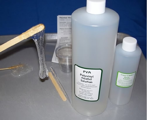 Contains 1 liter 4 % polyvinyl alcohol solution, 0.25 liters 4 % borax solution, pipet, stirrer, cups zip bag, MSDS and instructions.