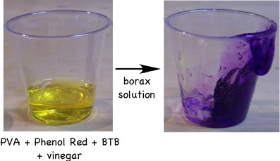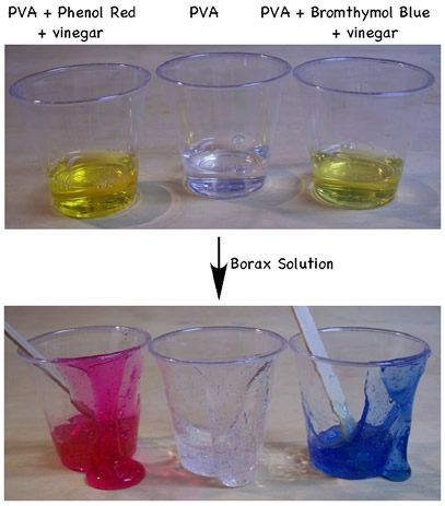 Learn about acids, bases and indicators and make a strange and fun gel. Use the Polyvinyl Alcohol Slime Kit and the Phenol Red and Bromthymol Blue Indicator Set Borax cross-links polyvinyl alcohol (PVA) and forms slime. Borax is also slightly basic or alkaline, changes the colors of the indicators. |