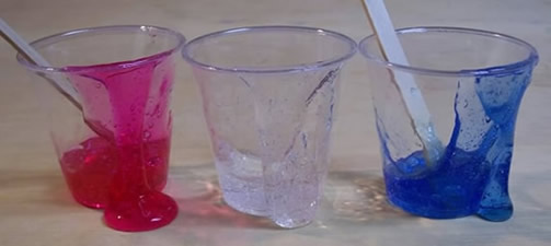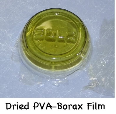 Let the purple slime dry out in a cup for a few days. It will become a hard plastic film and it will change colors. Slime is about 95 % water. As the water evaporates, the pH changes and that changes the color of the indicator. Put the dried film back in a cup with a little water and the film will reaborb water and become like "slime" again. |